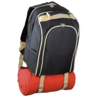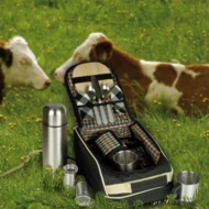 Luxurious picnic backpack. The high-quality robust outer material made of polyester and its compactness make it a really amazing item. But it provides even more: a cooling compartment on the back and a spacious inner compartment including excellent equipment like, a stainless steel isolating flask with 1l capacity, two 0,2l stainless steel cups, stainless steel salt and pepper shakers, a snack tray, cutlery and napkins. We will put your logo on the front compartment.