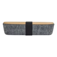 Filcowy piórnik z bambusową pokrywą i elastycznym paskiem. Pokrywka posiada uchwyt na telefon i linijkę.