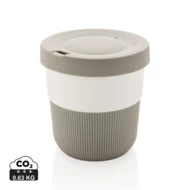 A sustainable alternative to traditional cups! Bringing style and practicality to your morning commute, this PLA coffee cup is ideal for transporting your favourite hot beverage. Manufactured from plant material (PLA), so not only stylish but also kind for the planet. Comes with a silicone grip and lid for your convenience. Fits conveniently under most coffee machines. 100% melamine free. Capacity 250 ml.