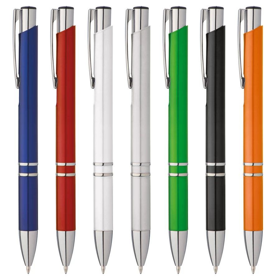 Plastic ballpen with blue-writing plastic refill and silver applications. Your logo will be printed below the clip.