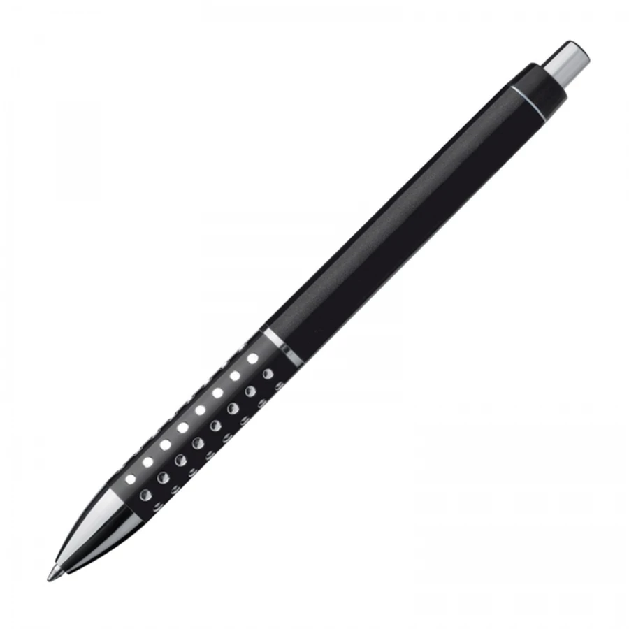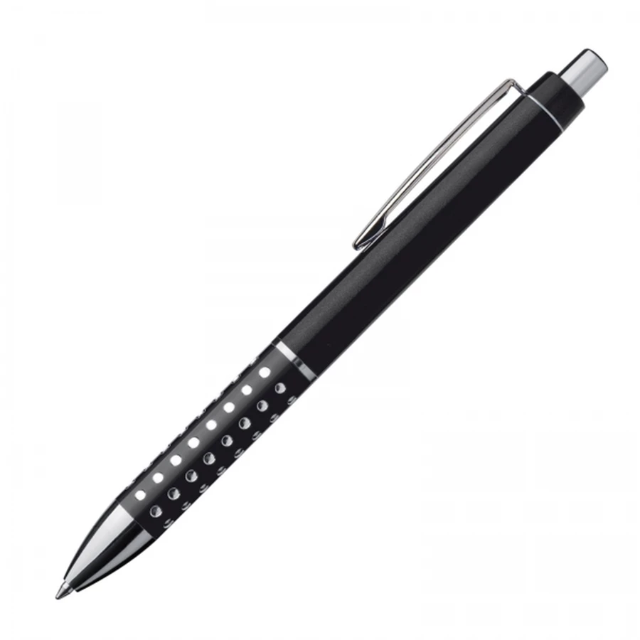 Plastic ball pen with sparkling dot grip zone and a large blue refill.