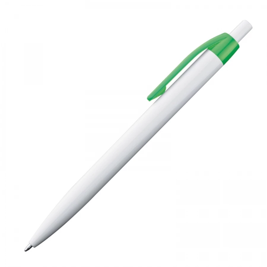 Trendy push-button ball pen with a blue-writing plastic refill. Due to the white body, the luminous clip colours appear even more striking.