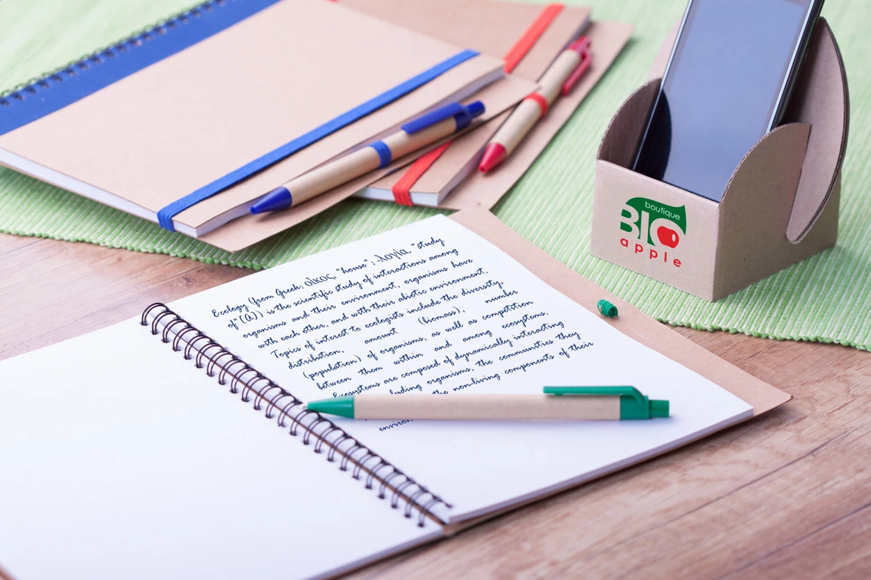 Recycled paper, 60 blank sheets spiral notebook with paper ballpoint pen.
