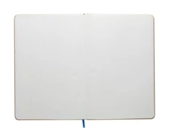 Recycled cardboard covered notebook with 100 blank sheets, coloured bookmark and rubber strap.