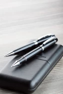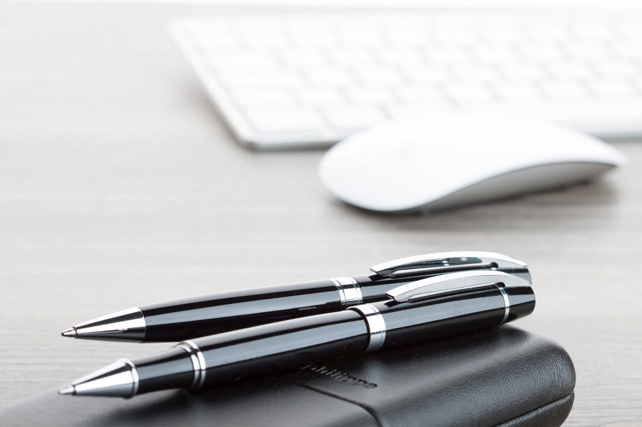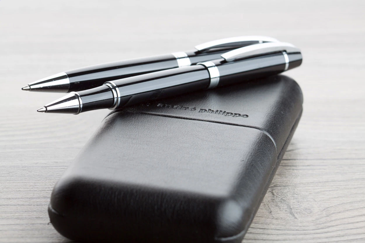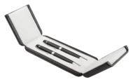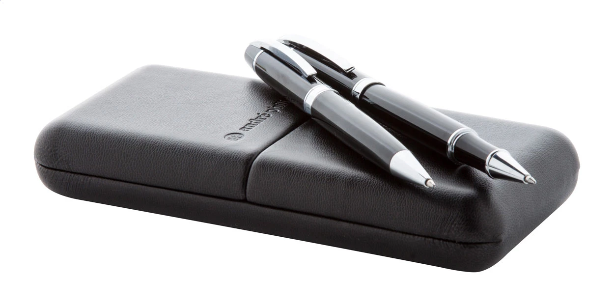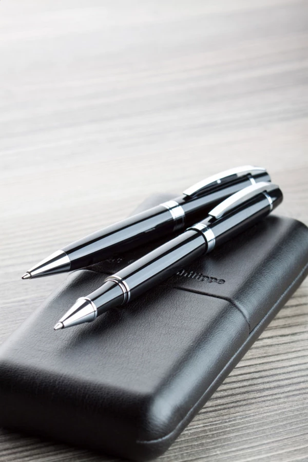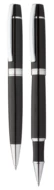 Elegant, metal ballpoint pen and roller pen set, with shiny chrome parts. In PU leather gift box, with blue refill. André Philippe brand product.