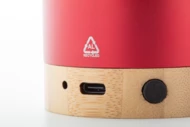 Recycled aluminium wireless speaker with bamboo base. With hands-free call function and built-in rechargeable battery. Including USB charger cable.
