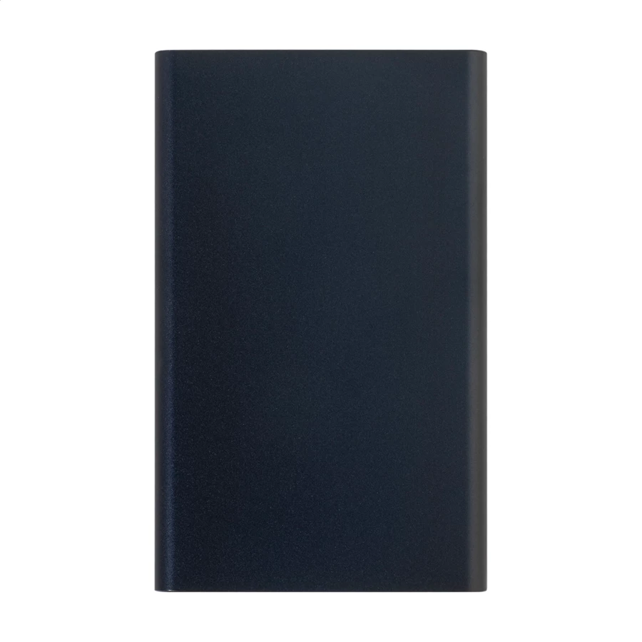 USB power bank in recycled aluminium housing with 4000 mAh battery. With 1 USB and 1 USB-C charger ports. USB-C input port. Including USB charger cable.