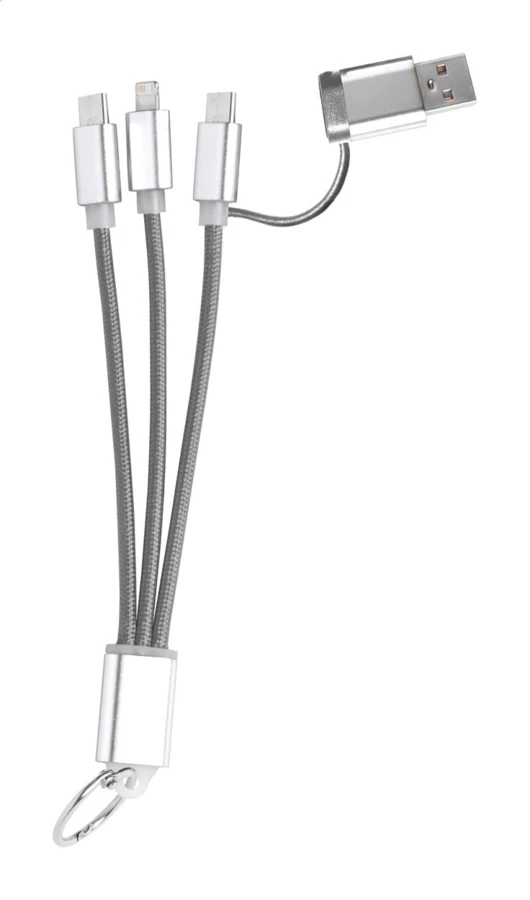 Aluminium USB charger cable with keyring. With micro USB, USB-C and Lightning connectors. With USB and USB-C inputs.