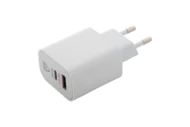 Recycled ABS fast-charging USB wall charger with 1 USB and 1 USB-C port. Supports quick charging technology (PD20W / QC3.0). With 2-pole European plug.