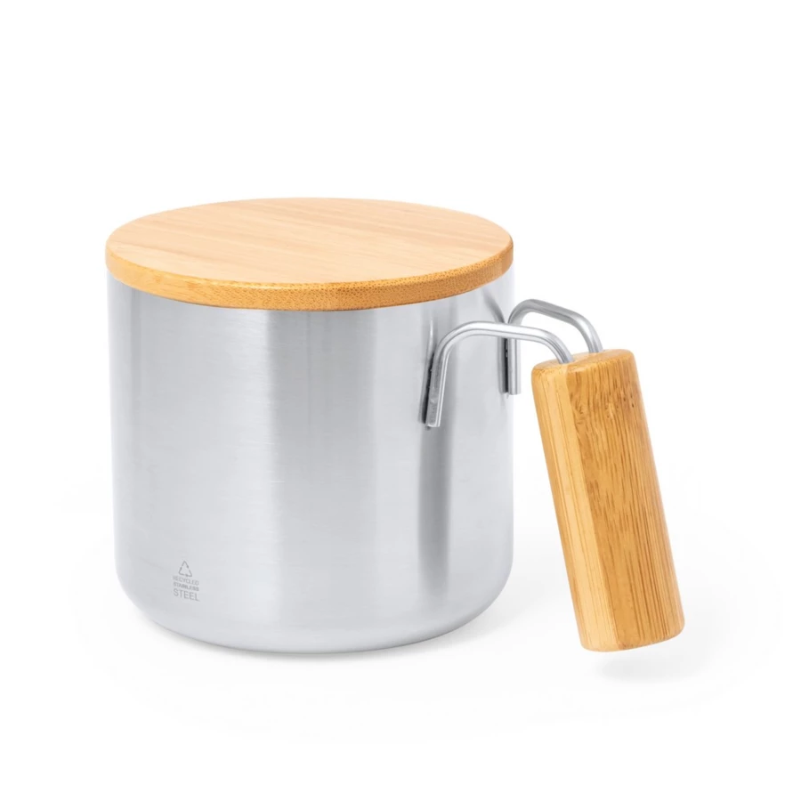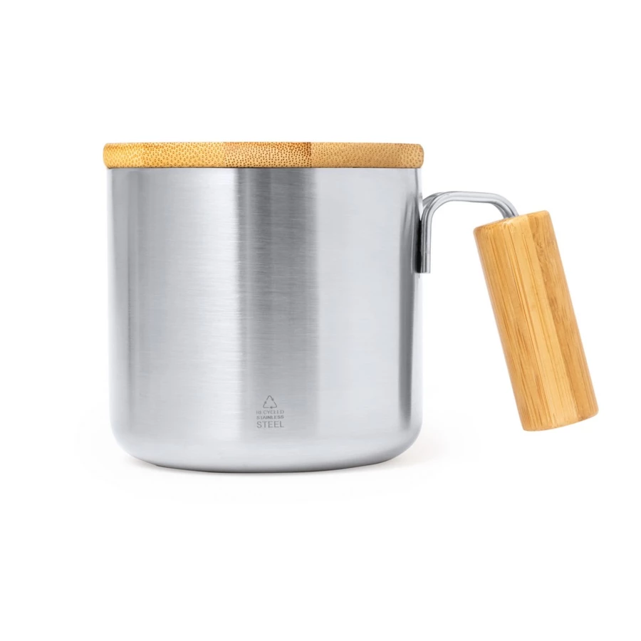 Unique double walled 330ml capacity thermal mug. Made of recycled stainless steel, with bamboo lid and matching comfort grip handle. With Recycled Stainless Steel logo. Presented in an individual kraft design box and in a recycled bag.Steel is one of the most demanded materials and can be found almost everywhere, from everyday products to major constructions. With countless properties, including durability and a high level of reusability, it is a much valued alternative for sustainable solutions. Properly treated, new resources of infinite use can be obtained.