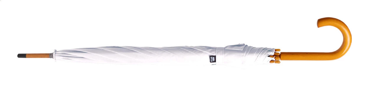 Automatic umbrella with 8 panels, metal frame, wooden shaft, handle and tips. 190T RPET pongee. With distinctive RPET label.