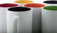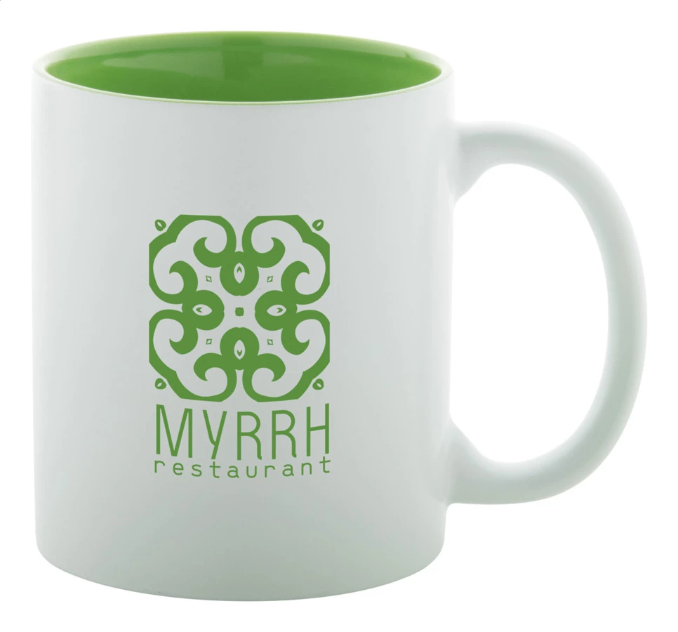 White ceramic mug with coloured inside, 350 ml. With special coating for engraving, the engraved logo is matching the inside colour. In gift box.