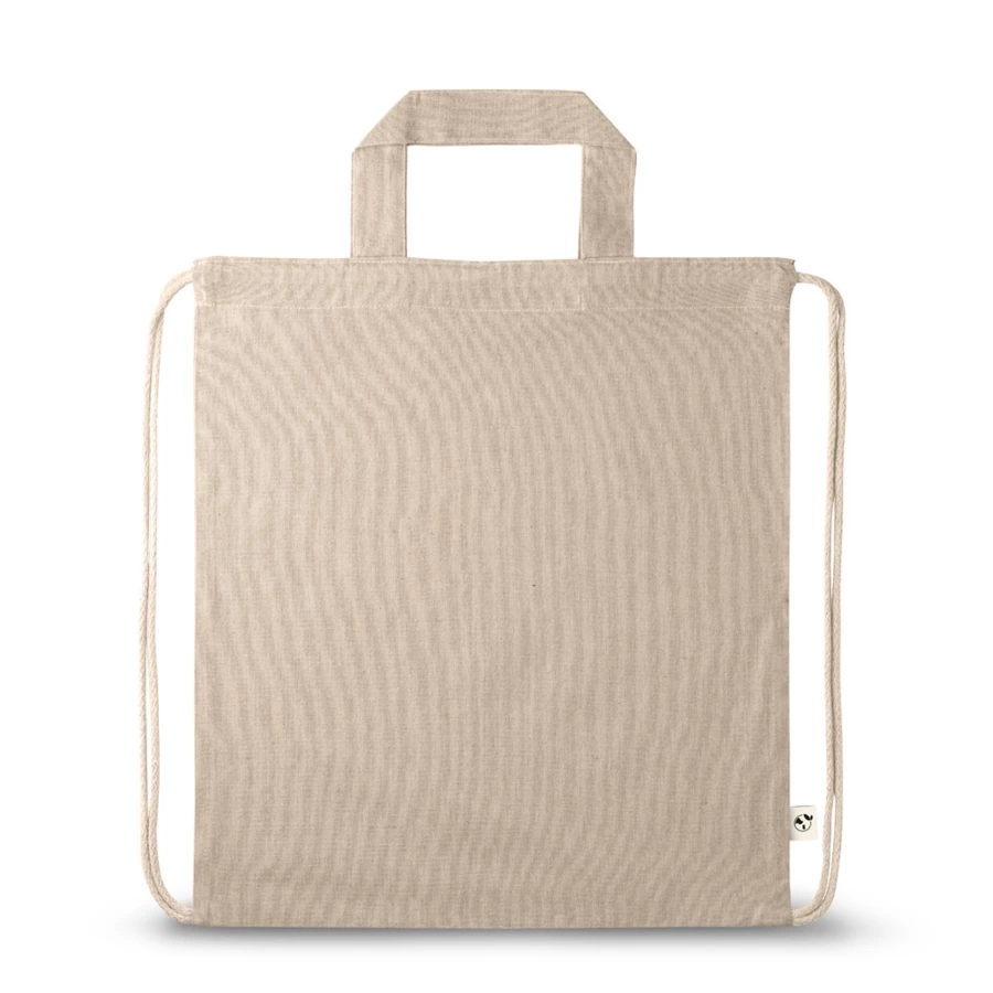 Drawstring bag in recycled cotton (70%) and polyester (30% rPET) (140 g/m²), with 30 cm handles and cotton cords for closure. Recycled cotton is undyed. The raw material is used in its original form and color, without the use of dyeing or bleaching chemicals, contributing to a lower impact. 370 x 410 mm