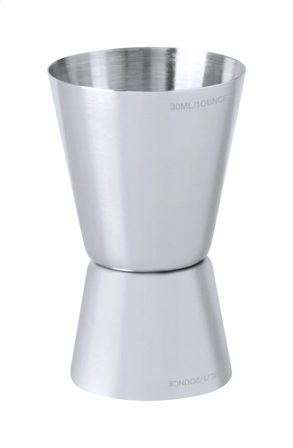 Stainless steel jigger to measure 1 or 1/2 ounce.