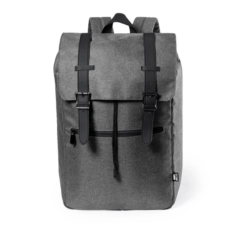 Urban backpack in nature line, made of resistant 300D RPET PVC-free polyester, made from recycled plastic, in order to promote the reuse of plastic waste and contribute to the sustainability of the planet. Main pocket with straps and metal buckle closures with front zip pocket and metal puller. Inside with padded pocket for laptop up to 15 inches and tablet up to 10 inches. Adjustable padded shoulder straps, with RPET emblem on outside label.