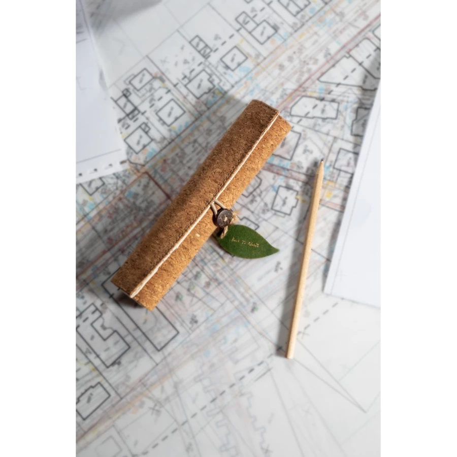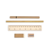 School set in cork pouch with ruler (15 cm/6 inch), ball pen, pencil (unsharpened), eraser and pencil sharpener