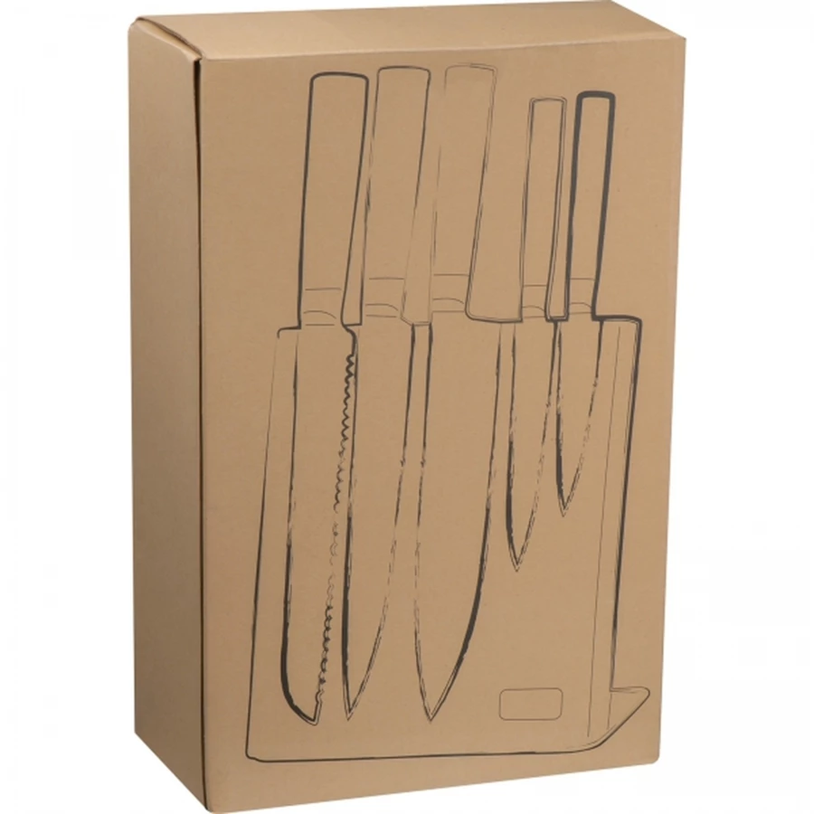 Wooden magnetic knife block including 5 stainless steel knives with ergonomic handle. The knives hold thanks to the magnet in the wooden plate. We will engrave your logo on the plate or a knife.