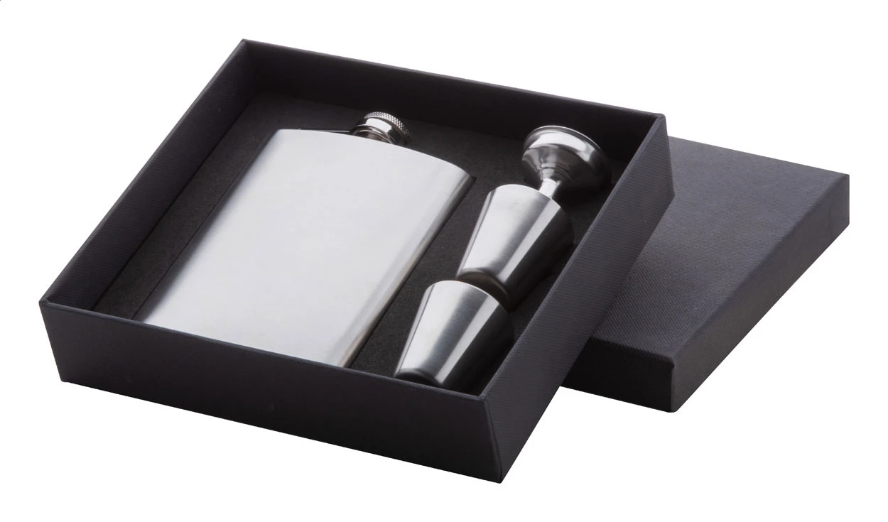 Stainless steel hip flask with 2 shot glasses and a funnel, 230 ml. In black gift box.