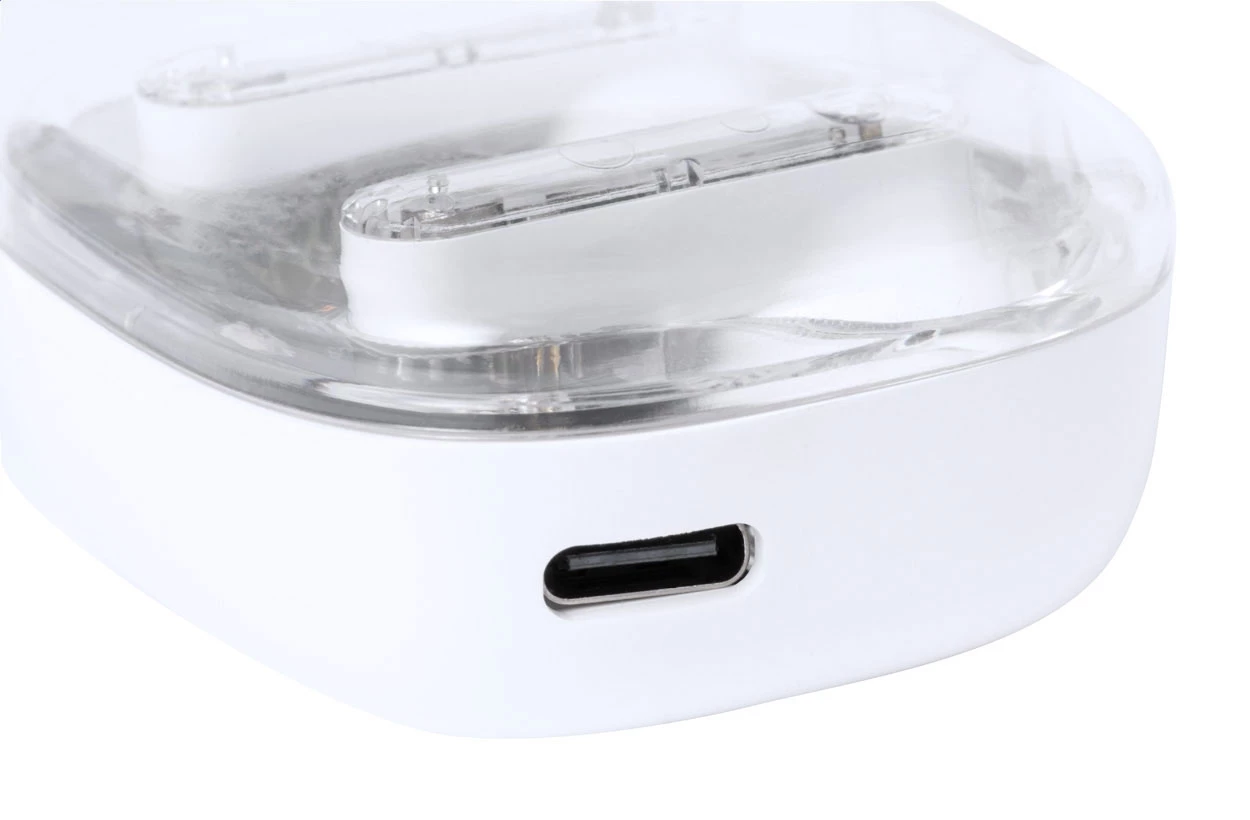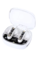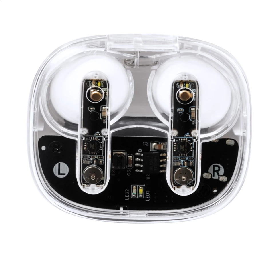 Semi-transparent, true wireless stereo (TWS) earphones with visible electronic components and hands-free call function. In semi-transparent plastic charger case. Including USB charger cable.