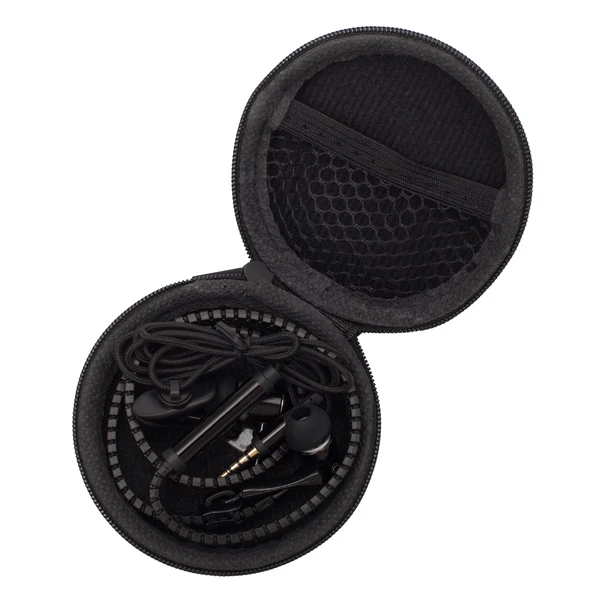 Słuchawki douszne wyposażone w mikrofon i przycisk do odbierania połączeń. Kabel z zamkiem zapobiega splątaniu. Pakowane w usztywnione etui z ekoskóry chroniące słuchawki przed uszkodzeniem. Wtyk: 3,5 mm audiojack; długość kabla: 1,2 m; średnica głośnika: 10 mm; pasmo przenoszenia: 16hz-20khz; Impedancja 16-32Ω, SPL czułość: 105±3 dB (dla 1KHz, 6 mW); THD (zniekształcenia harmoniczne): <1%.
