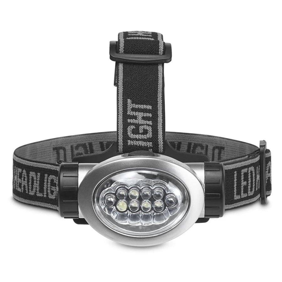 Headlamp with adjustable elastic strap and vertical tilt. It's the ideal solution for use when camping, hunting, climbing or hiking in poorly lit areas. It has 3 lighting modes: medium intensity beam (4 white LEDs), maximum intensity of 30 lumen (8 white LEDs), and flash mode (2 red LEDs). Includes 3 AAA batteries. Supplied in a gift box. Elastic band Top: 260 x 14 mm | Round: 430 x 24 mm | Mounting bracket: 71 x 49 x 2 mm | Flashlight: 85 x 56 x 55 mm