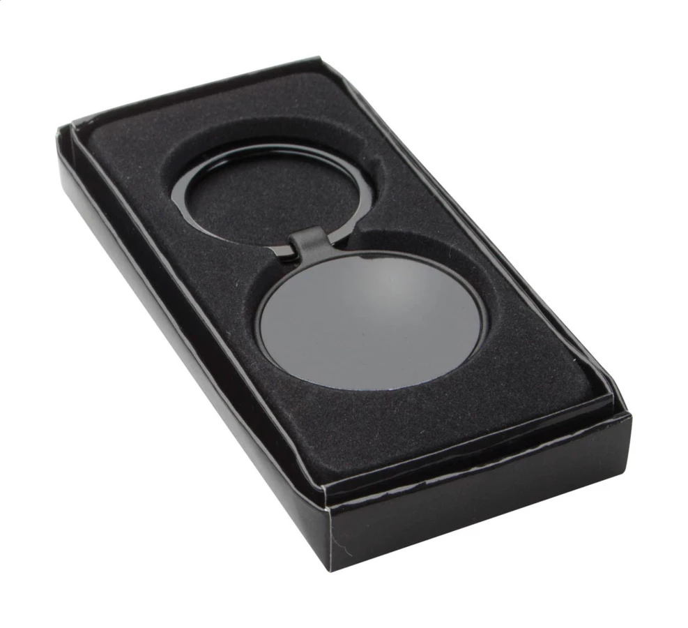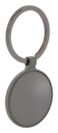 Round shaped metal keyring with gunmetal finish and shiny plates on both sides. In black gift box.