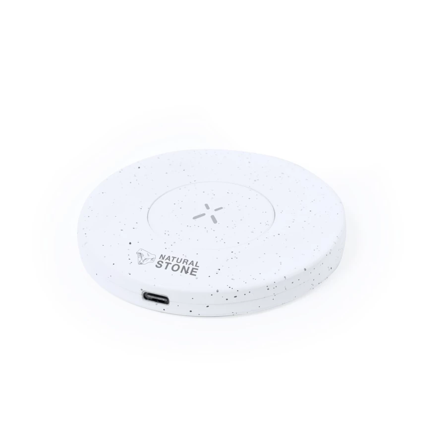 Wireless circular charger 15W, made from natural stone extracts in combination with resistant ABS. Non-slip base and LED charging status indicator. Type C cable included and compatible with smartphones with wireless charging technology. Presented in an attractive kraft design box.Made from natural stone extracts, helping to reduce the use of plastics, as well as providing a smooth and resistant finish.Manufactured according to RoHS standards and in compliance with the following safety requirements: Overheating protection system. Over-charge protection system. Blocking system to prevent short circuits.