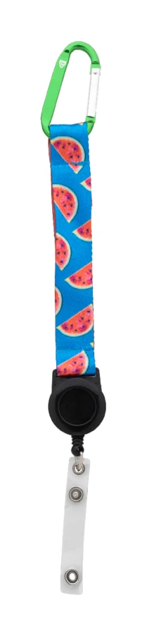 Custom made RPET polyester keyring with sublimation printed graphics on both sides. With inside RPET label, telescopic badge holder, aluminium carabiner and metal keyring. MOQ: 100 pcs.