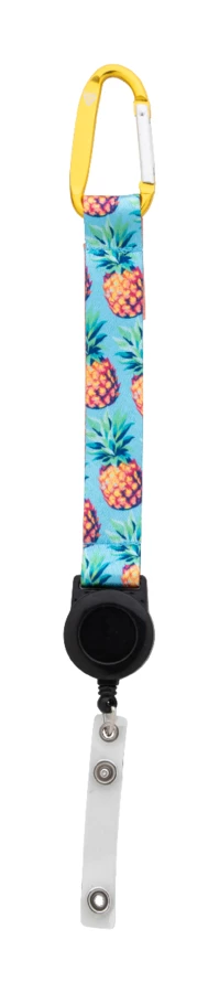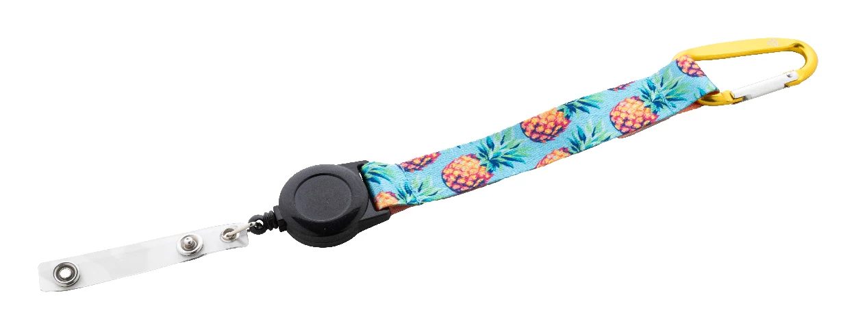 Custom made RPET polyester keyring with sublimation printed graphics on both sides. With inside RPET label, telescopic badge holder, aluminium carabiner and metal keyring. MOQ: 100 pcs.
