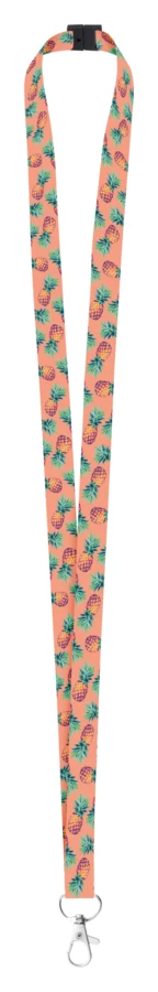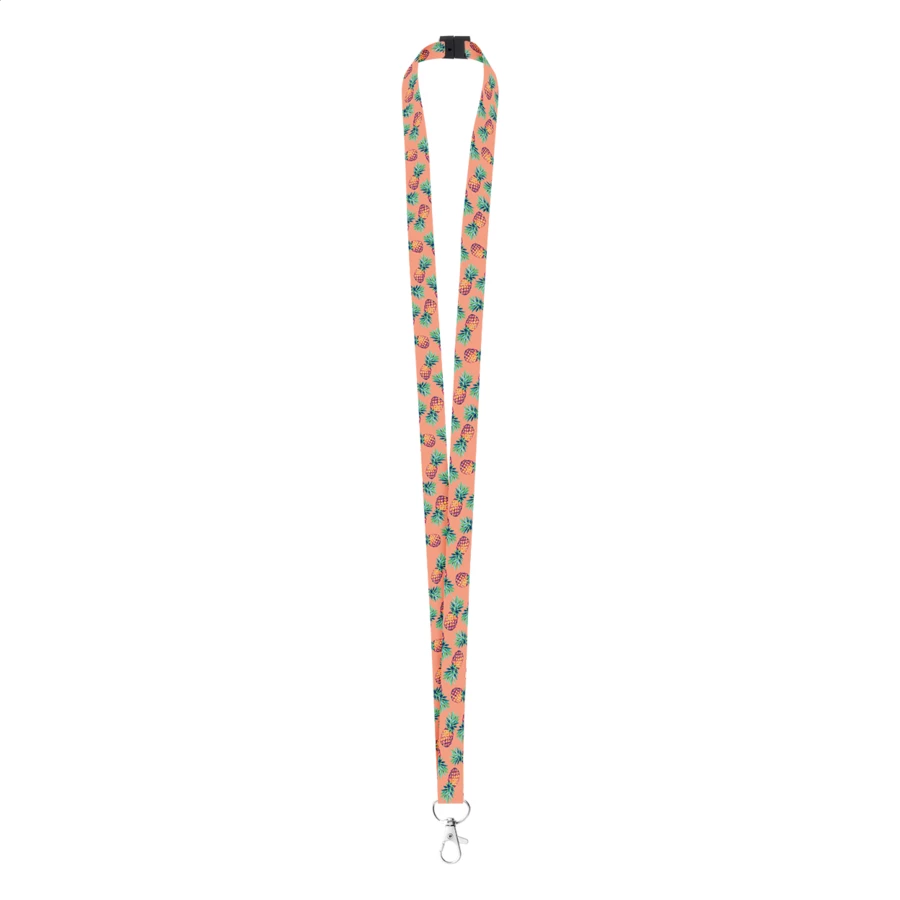 Custom made, 15 mm wide polyester lanyard with metal carabiner and safety buckle. With sublimation printed graphics on both sides. MOQ: 100 pcs.