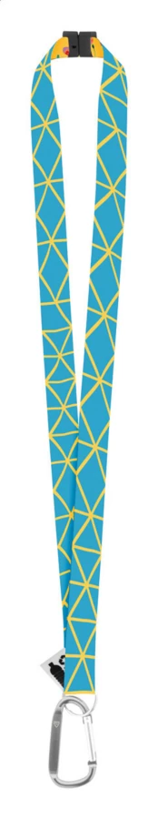 Custom made, RPET lanyard with large recycled aluminium carabiner and safety buckle. With sublimation printed graphics on both sides. MOQ: 100 pcs.