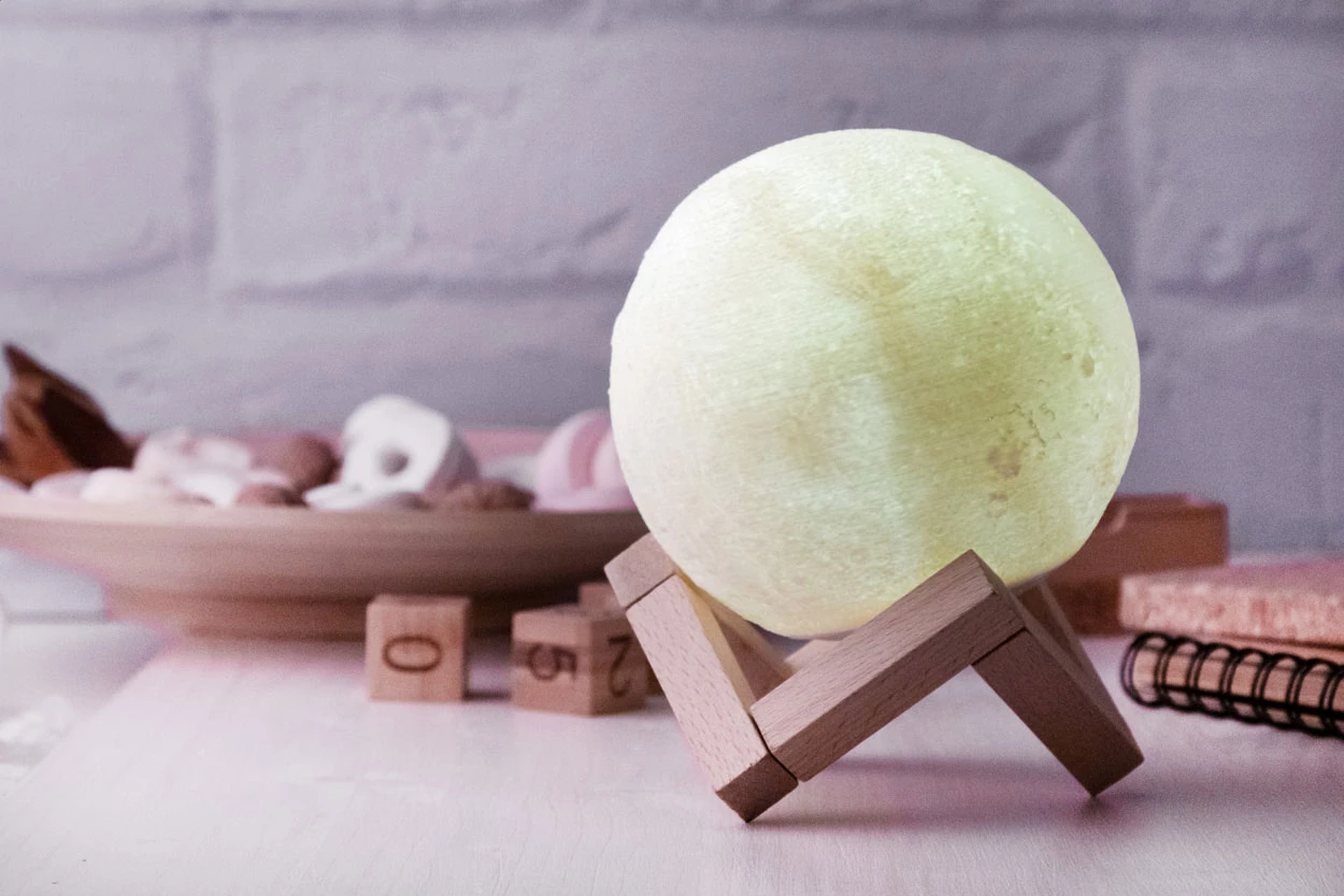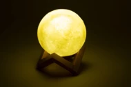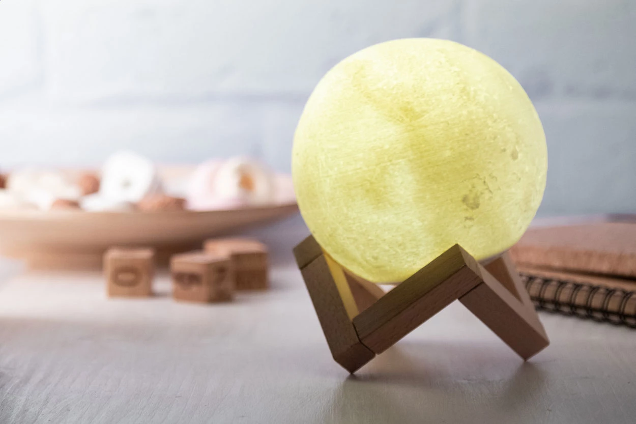 Moon shaped wireless speaker with built-in rechargeable battery and wooden stand. LED lights with warm and cold light and adjustable brightness. Including USB charger cable.
