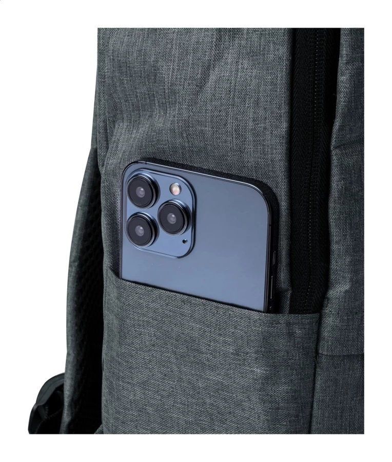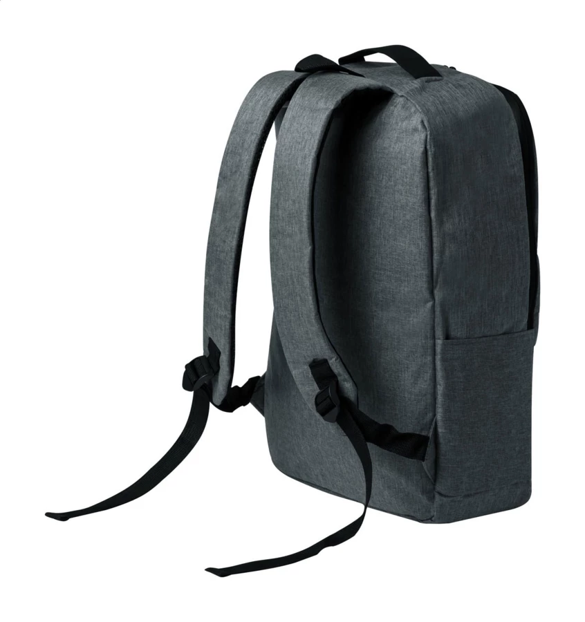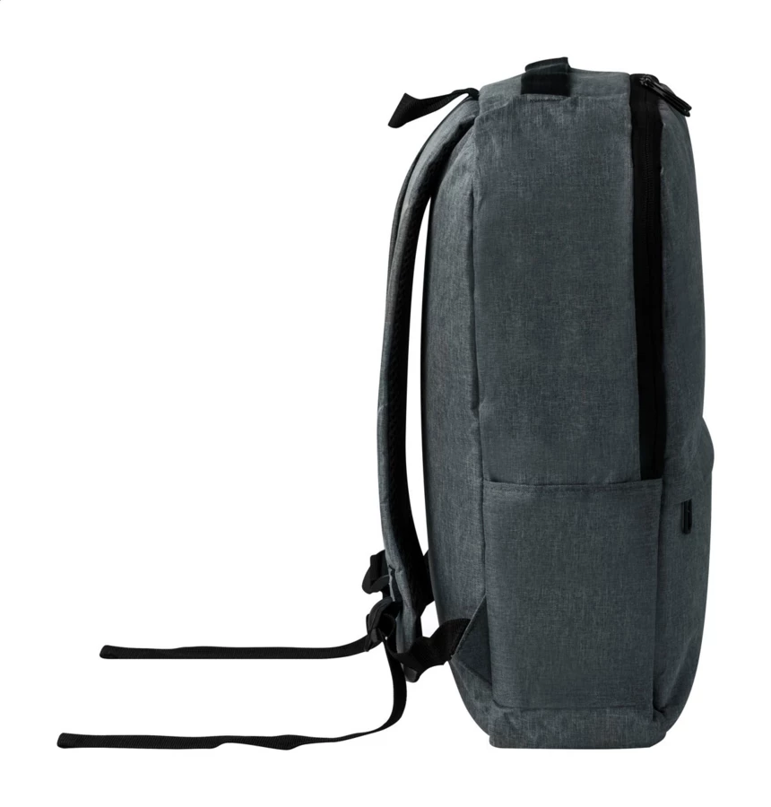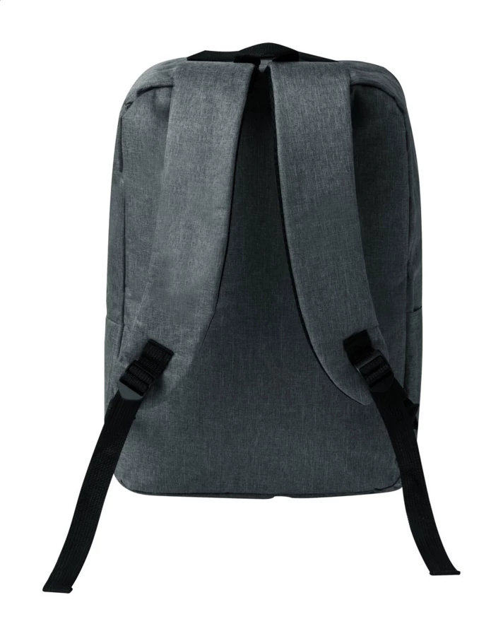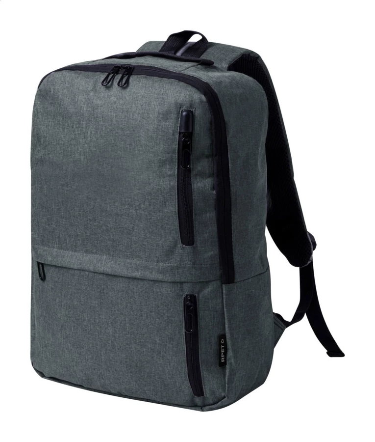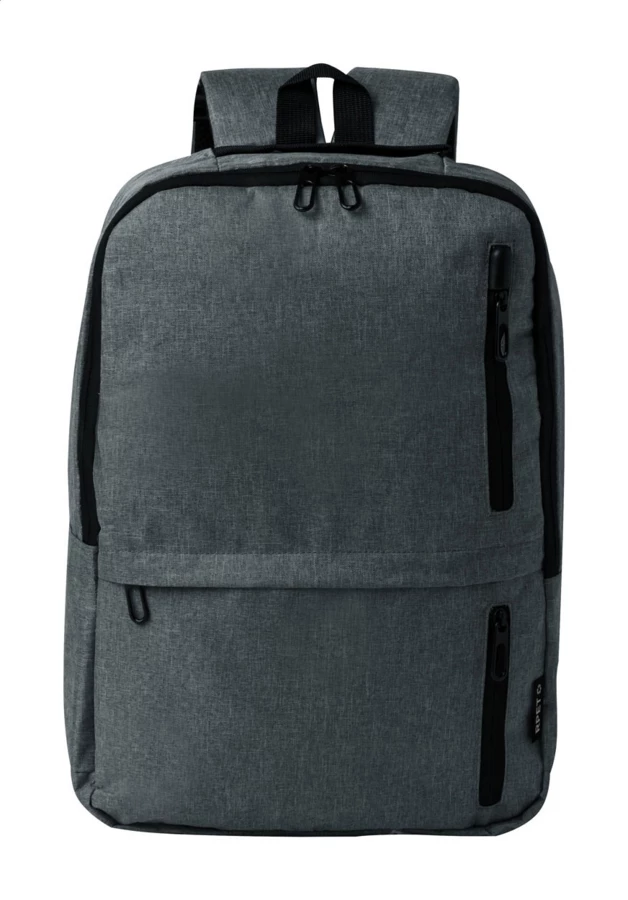 RPET backpack with zipped compartments, padded laptop (15") and tablet (10") compartment, padded back and shoulder straps. 600D RPET polyester with distinctive RPET label.