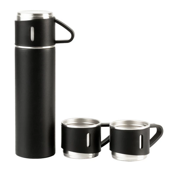 Termos o pojemności 500 ml w komplecie z 3 kubkami. Praktyczny zestaw na wędrówki i podróże w gronie przyjaciół lub rodziny. Pojemność kubka 150 ml.