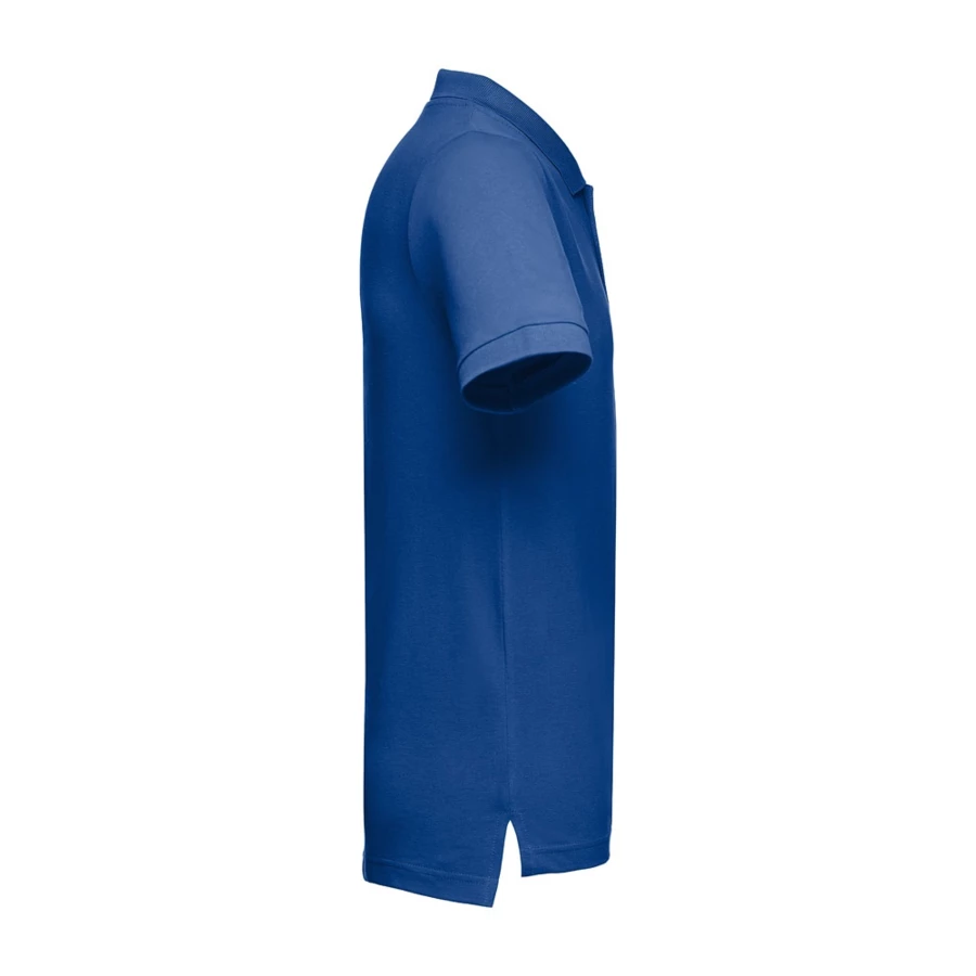 100% cotton carded piqué mesh short-sleeved men's polo (195 g/m²) (colour 183: 85% cotton/15% viscose). With a regular fit, this polo has rib collar and sleeves. The collar is reinforced with piqué ribbon. On the front, next to the collar, there are three matching colour buttons (extra button inserted in the inner seam). Piece cut and sewn with small side vents at the hem of the polo. Sizes: S, M, L, XL, XXL