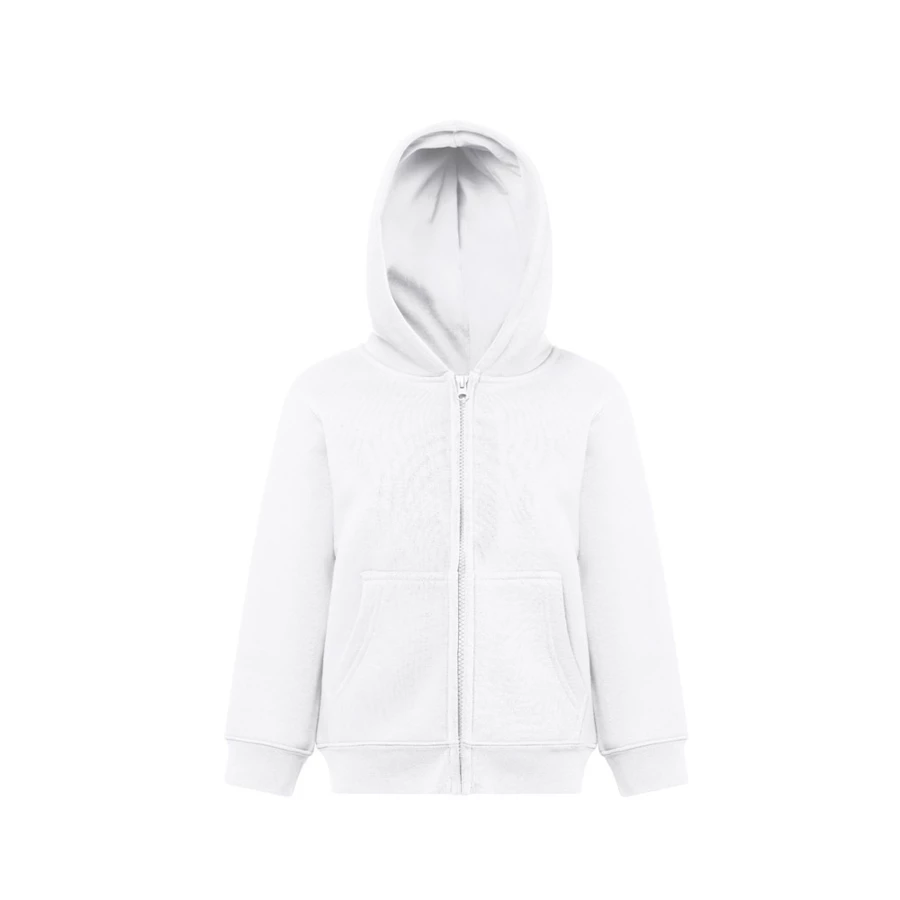Enzyme-treated children's jacket in America terry (50% cotton using sustainable farming practices) and 50% recycled polyester (320 g/m²). Hood without drawstrings and lined in jersey in the same colour as the jacket, complying with European Union safety standards. Contains 1x1 rib cuffs and bottom, 2 side pockets, zipper with slider, puller and carded interior. Sizes: 4, 6, 8, 10, 12