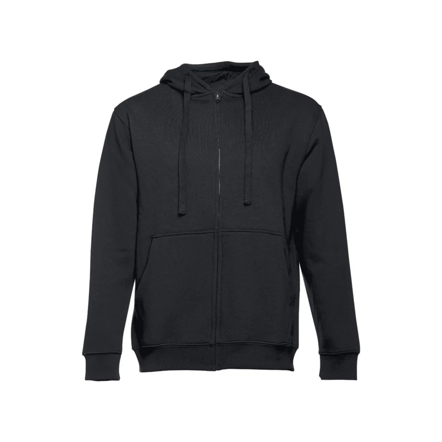 50% cotton and 50% polyester men's sweatshirt (320 g/m²) with carded interior. The hood is lined and contains colour cord closure. The front area has two marsupial pockets with plastic cover closure. Piece with cuffs and ribbon waistband. Sizes: S, M, L, XL, XXL