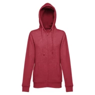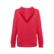 50% cotton and 50% polyester women's sweatshirt (320 g/m²) with carded interior. The hood is lined and contains colour cord closure. The front area has two marsupial pockets with plastic cover closure. Piece with cuffs and ribbon waistband. Sizes: S, M, L, XL, XXL
