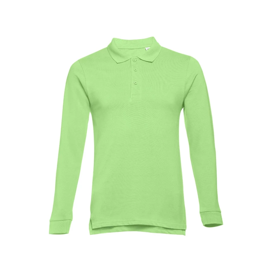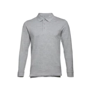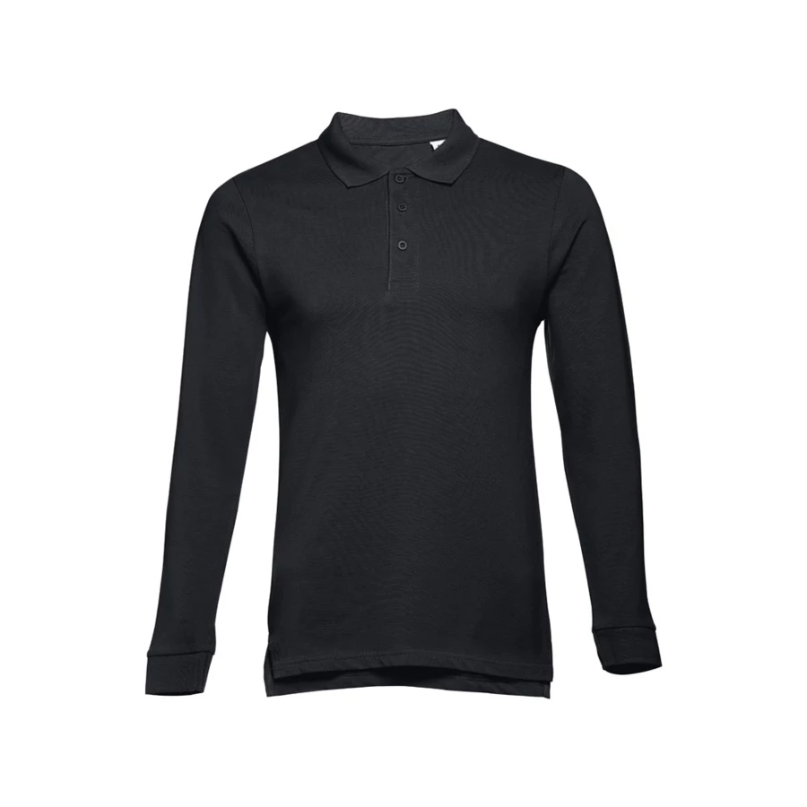 Long-sleeved polo for men in piqué 100% carded cotton (210 g/m²) (colour 183: 85% cotton/15% viscose). Regular cut polo with rib collar and cuffs, the collar being reinforced with piqué knit ribbon. Contains a reinforced collar with 3 matching colour buttons (extra button inserted in the inner seam). Piece cut and sewn with side vents at the hem. The visible label is removable. Sizes: S, M, L, XL, XXL
