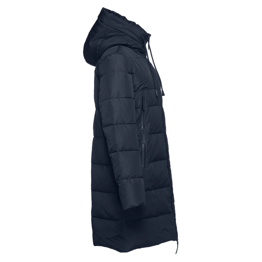 Long padded parka (unisex) in 100% polyester (exterior: 75 g/m² 300T polyester pongee coating, interior: 100% polyester 50 g/m², filling: 335g/m²). With lined and padded hood and elastic cuffs. Warm and sturdy parka with decorative topstitching, with interior and front pockets with waterproof zippers. Sizes: S, M, L, XL, XXL