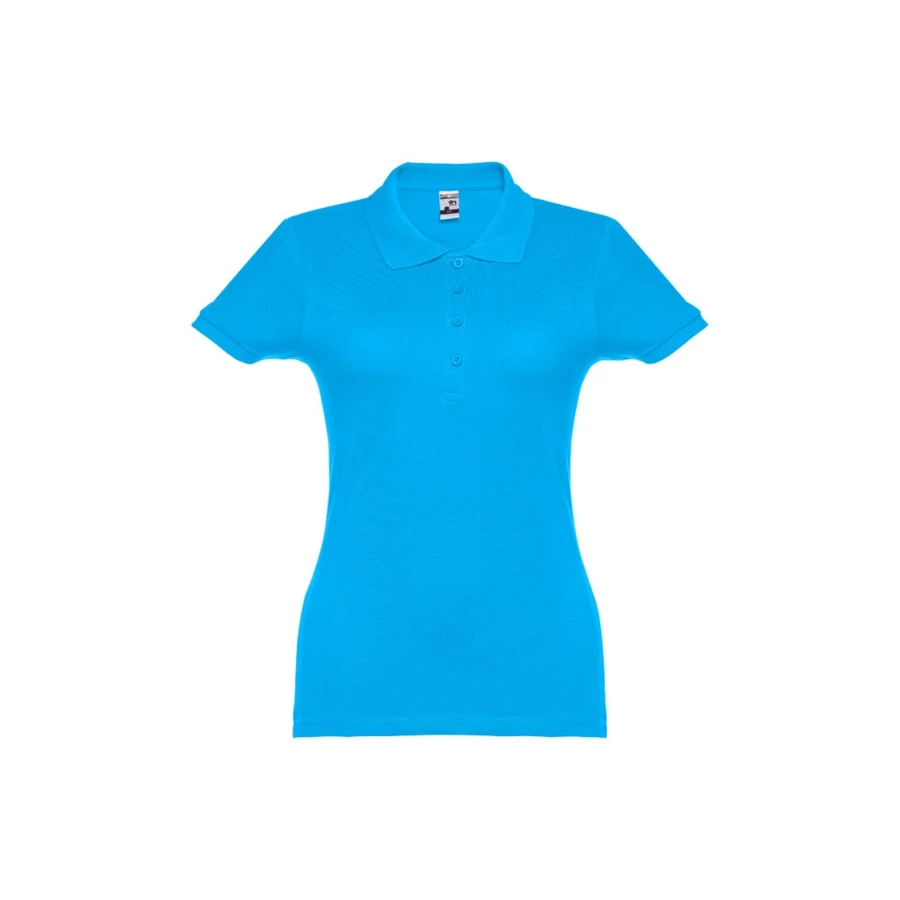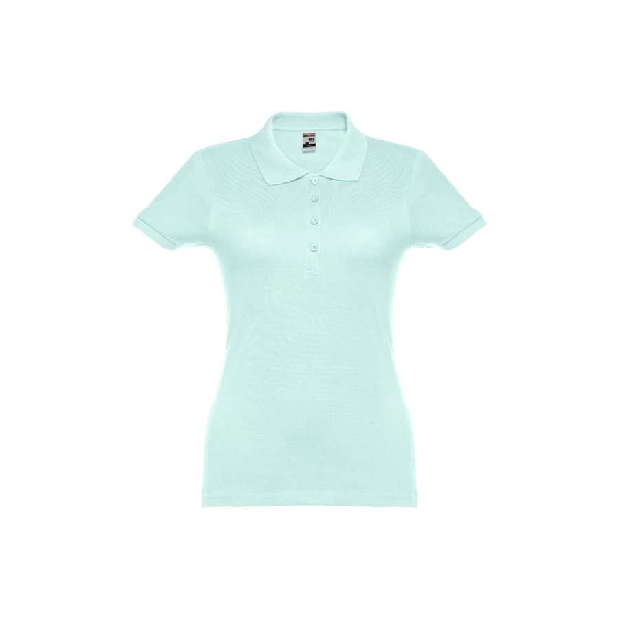 100% carded cotton pique women's short sleeve polo (195 g/m²) (colour 183: 85% cotton/15% viscose). Features a rib collar and sleeves, the collar is reinforced with piqué ribbon. On the front, next to the collar, there are four matching colour buttons (extra button inserted in the inner seam). Piece cut and sewn. Sizes: S, M, L, XL, XXL