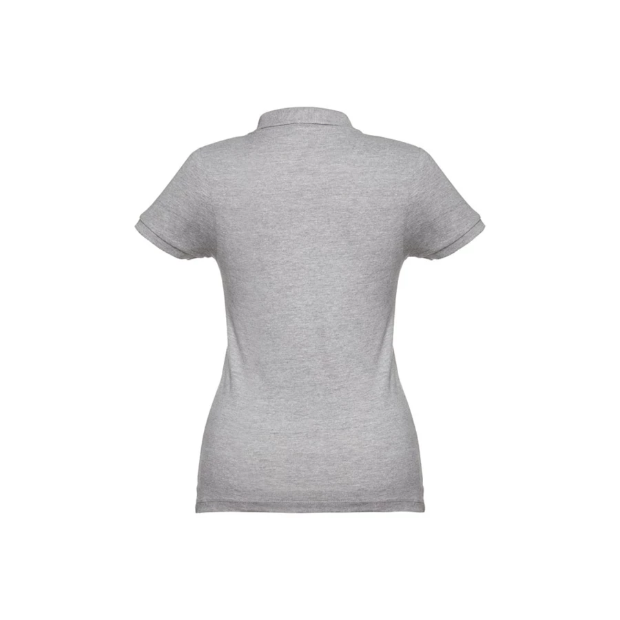100% carded cotton pique women's short sleeve polo (195 g/m²) (colour 183: 85% cotton/15% viscose). Features a rib collar and sleeves, the collar is reinforced with piqué ribbon. On the front, next to the collar, there are four matching colour buttons (extra button inserted in the inner seam). Piece cut and sewn. Sizes: S, M, L, XL, XXL