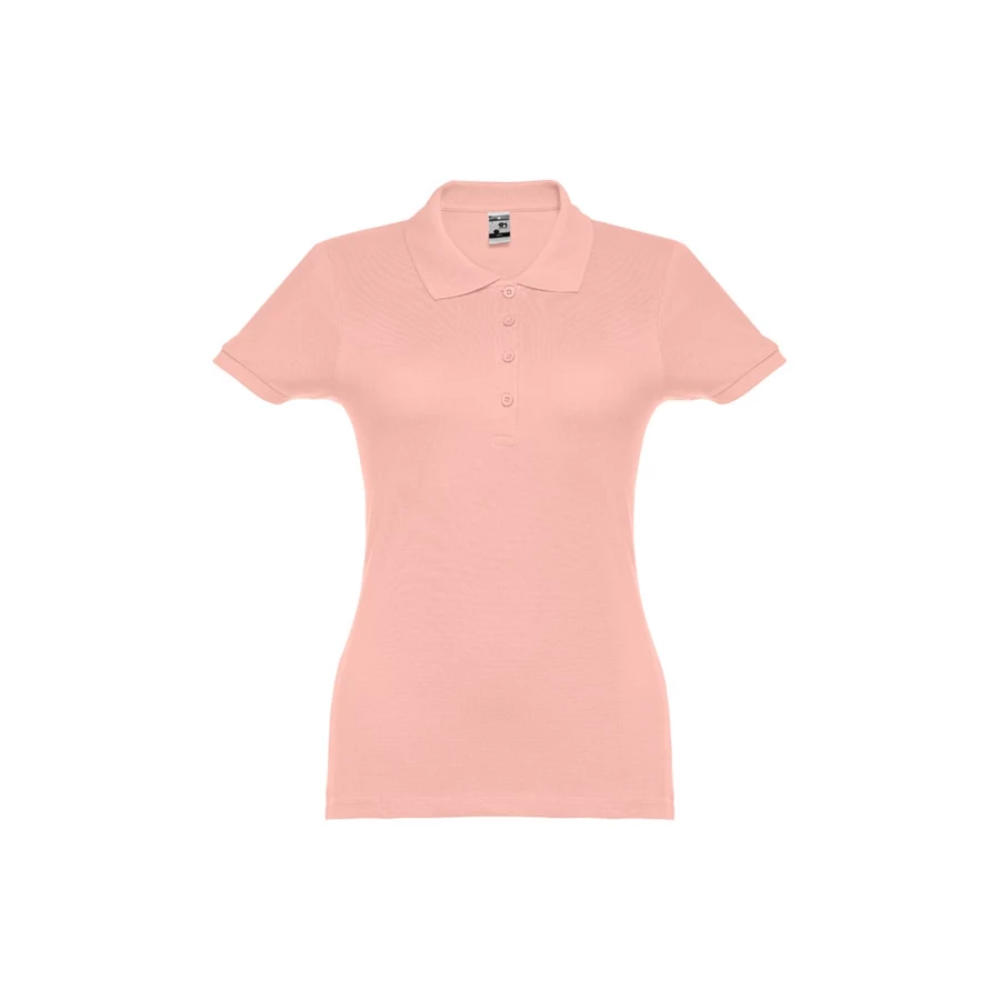 100% carded cotton pique women's short sleeve polo (195 g/m²) (colour 183: 85% cotton/15% viscose). Features a rib collar and sleeves, the collar is reinforced with piqué ribbon. On the front, next to the collar, there are four matching colour buttons (extra button inserted in the inner seam). Piece cut and sewn. Sizes: S, M, L, XL, XXL