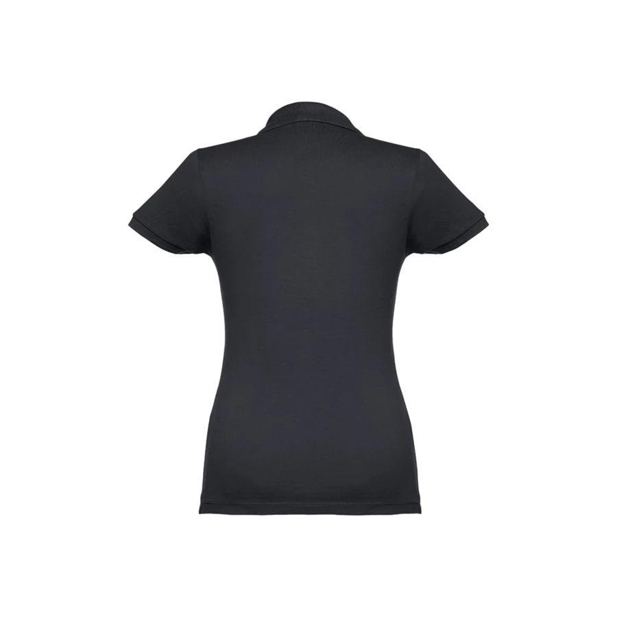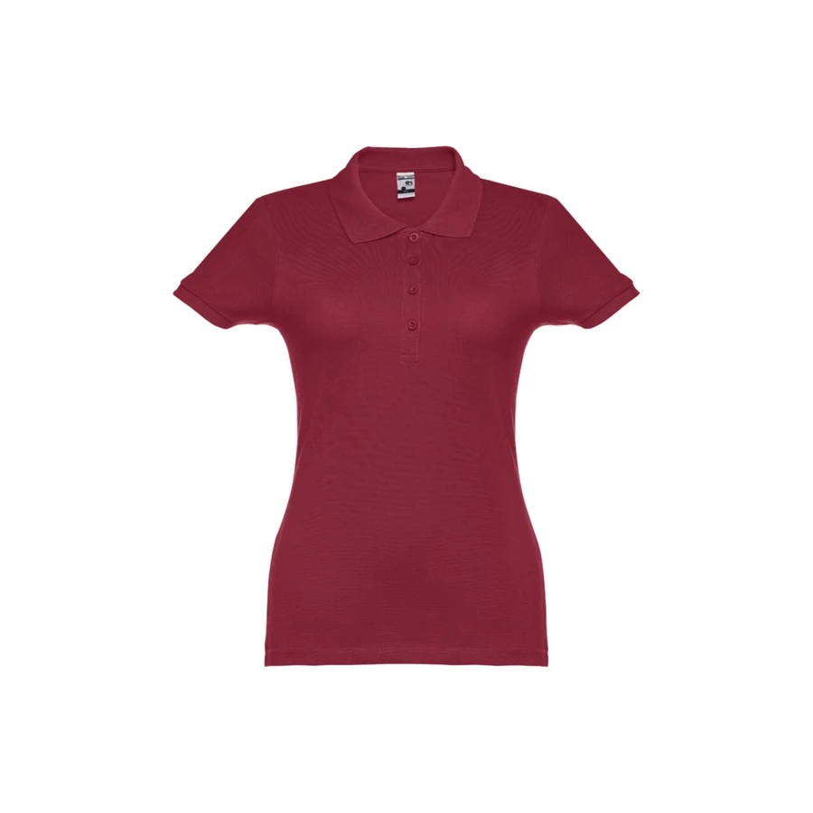 100% carded cotton pique women's short sleeve polo (195 g/m²) (colour 183: 85% cotton/15% viscose). Features a rib collar and sleeves, the collar is reinforced with piqué ribbon. On the front, next to the collar, there are four matching colour buttons (extra button inserted in the inner seam). Piece cut and sewn. Sizes: S, M, L, XL, XXL