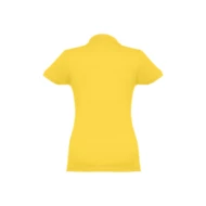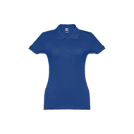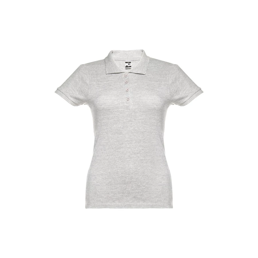 100% carded cotton pique women's short sleeve polo (195 g/m²) (colour 183: 85% cotton/15% viscose). Features a rib collar and sleeves, the collar is reinforced with piqué ribbon. On the front, next to the collar, there are four matching colour buttons (extra button inserted in the inner seam). Piece cut and sewn. Sizes: S, M, L, XL, XXL