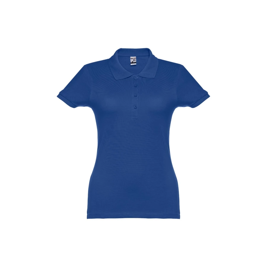 100% carded cotton pique women's short sleeve polo (195 g/m²) (colour 183: 85% cotton/15% viscose). Features a rib collar and sleeves, the collar is reinforced with piqué ribbon. On the front, next to the collar, there are four matching colour buttons (extra button inserted in the inner seam). Piece cut and sewn. Sizes: S, M, L, XL, XXL