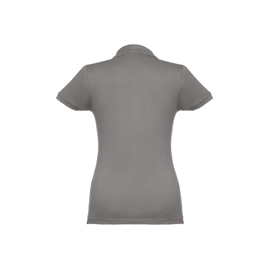 100% carded cotton pique women's short sleeve polo (195 g/m²) (colour 183: 85% cotton/15% viscose). Features a rib collar and sleeves, the collar is reinforced with piqué ribbon. On the front, next to the collar, there are four matching colour buttons (extra button inserted in the inner seam). Piece cut and sewn. Sizes: S, M, L, XL, XXL