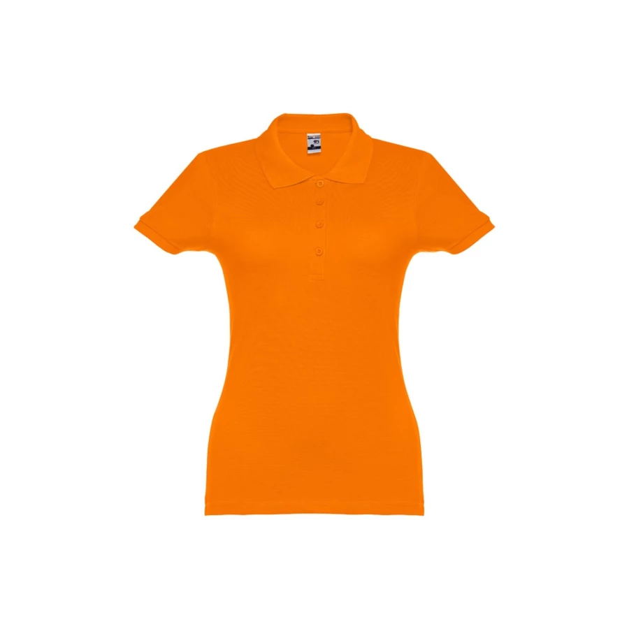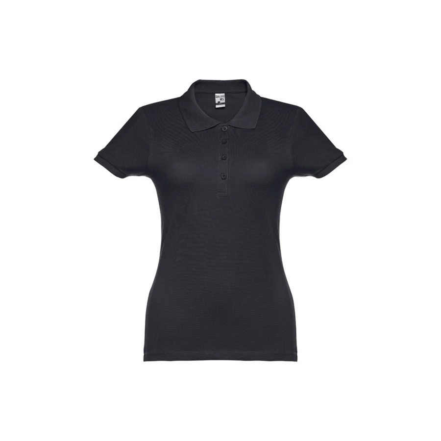 100% carded cotton pique women's short sleeve polo (195 g/m²) (colour 183: 85% cotton/15% viscose). Features a rib collar and sleeves, the collar is reinforced with piqué ribbon. On the front, next to the collar, there are four matching colour buttons (extra button inserted in the inner seam). Piece cut and sewn. Sizes: S, M, L, XL, XXL