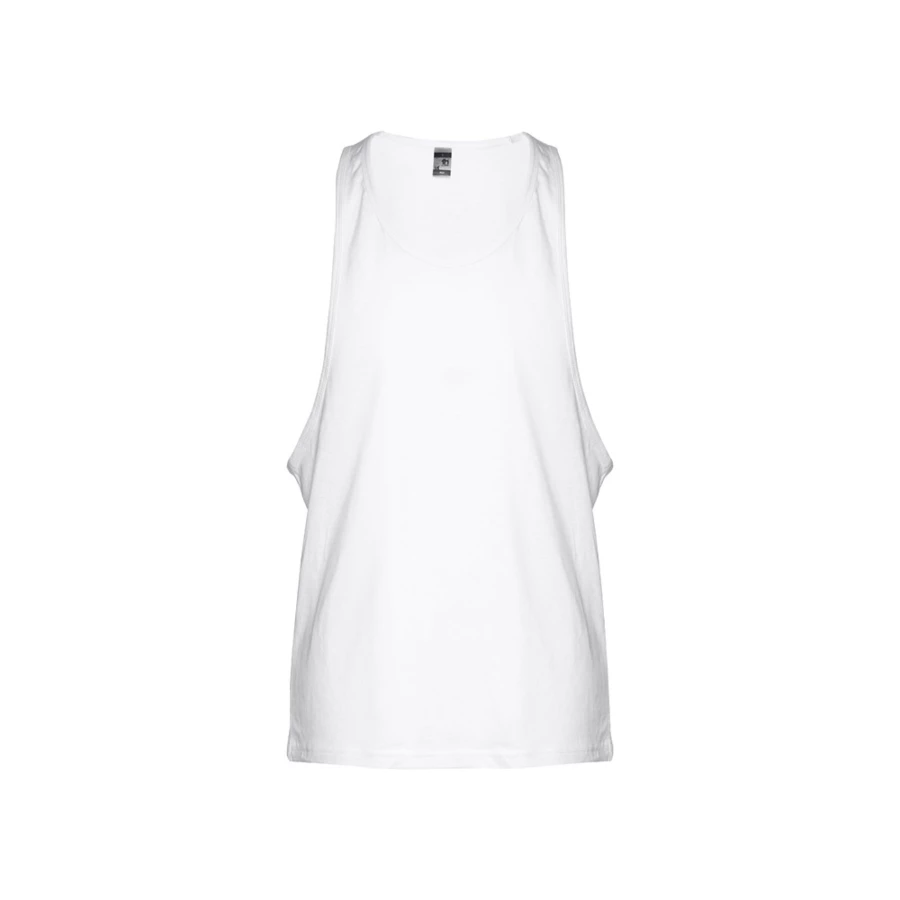 100% cotton men's sleeveless jersey (140 g/m²) with carded cotton yarn. Wide armholes and round collar, with bias tape on the armholes and neckline. Piece cut and sewn with double seam at the hemline. Sizes: XS, S, M, L, XL, XXL