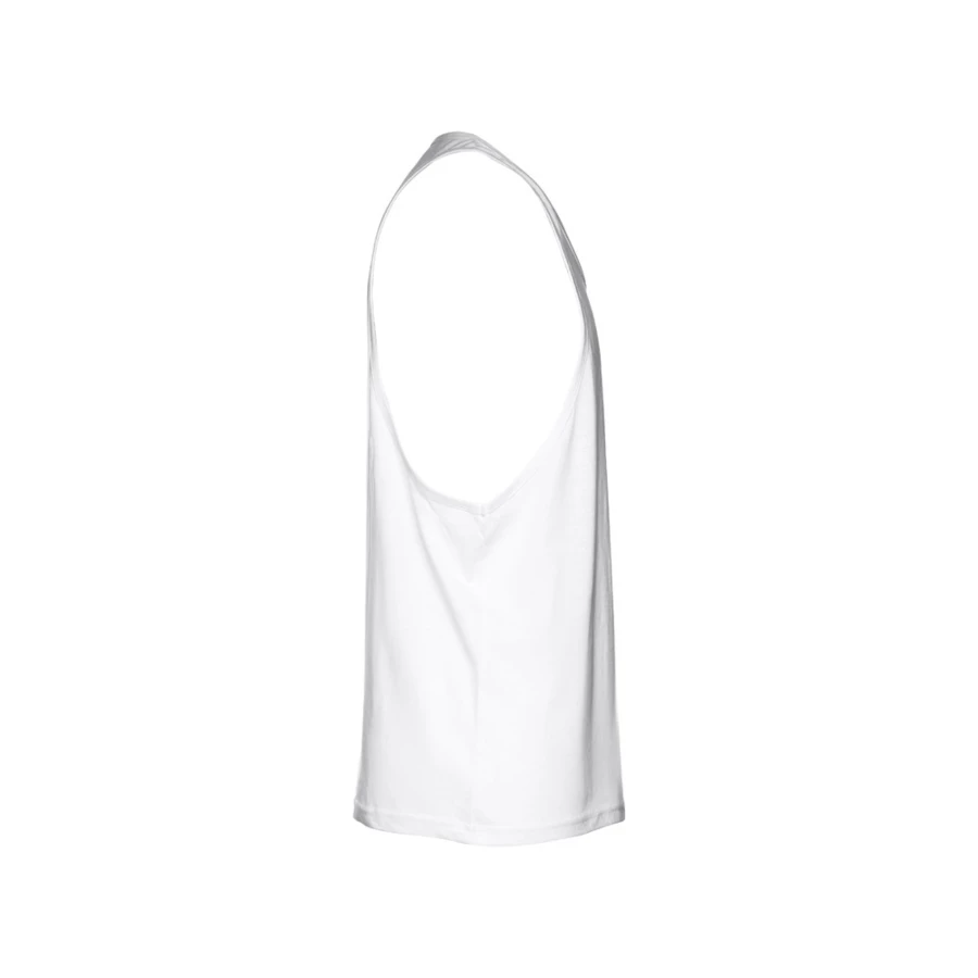 100% cotton men's sleeveless jersey (140 g/m²) with carded cotton yarn. Wide armholes and round collar, with bias tape on the armholes and neckline. Piece cut and sewn with double seam at the hemline. Sizes: XS, S, M, L, XL, XXL